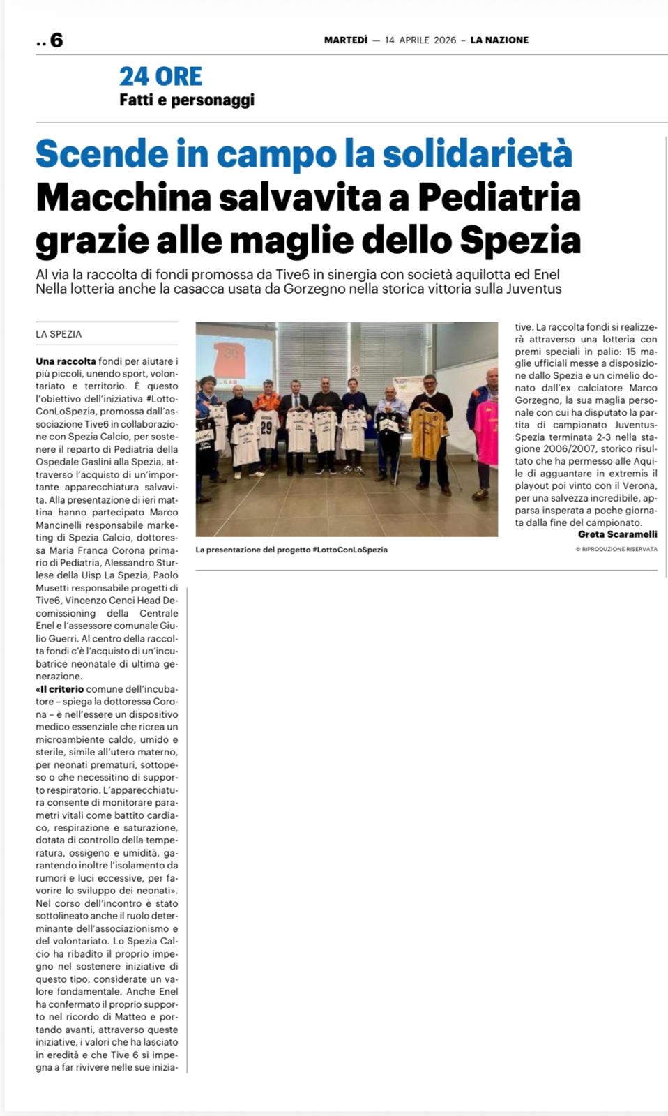 La raccolta fondi entrerà nel vivo sabato 18 aprile allo stadio Alberto Picco, in occasione della sfida tra Spezia e Sudtirol. In palio ci sono quindici maglie ufficiali dello Spezia Calcio, a cui si aggiunge un pezzo storico: la maglia della “vecchia gloria” Marco Gorzegno, indossata durante la celebre vittoria esterna per 3-2 contro la Juventus nell’anno della salvezza in Serie B. La maglia rossa sponsorizzata Hyundai con il numero 30: un vero pezzo da collezione. Lo stesso Gorzegno ha voluto far sentire la propria vicinanza al progetto attraverso un videomessaggio e ha annunciato la sua presenza al Picco sabato prossimo e il 4 maggio, quando le maglie in palio saranno consegnate ai vincitori, i cui biglietti saranno abbinati ai primi estratti delle ruote nazionali.